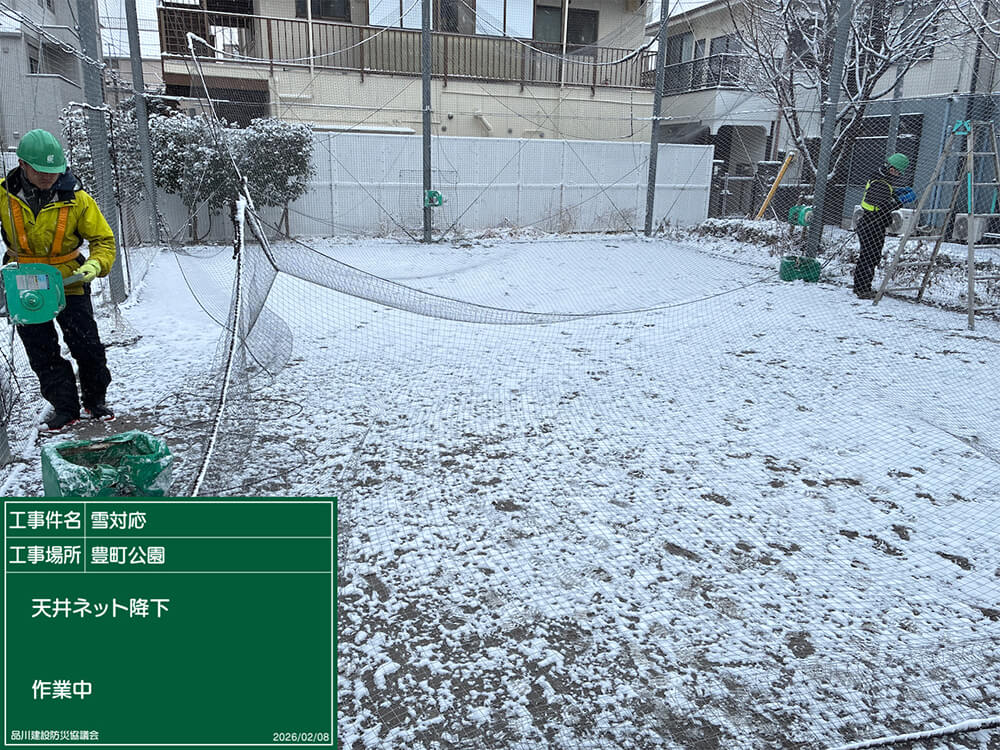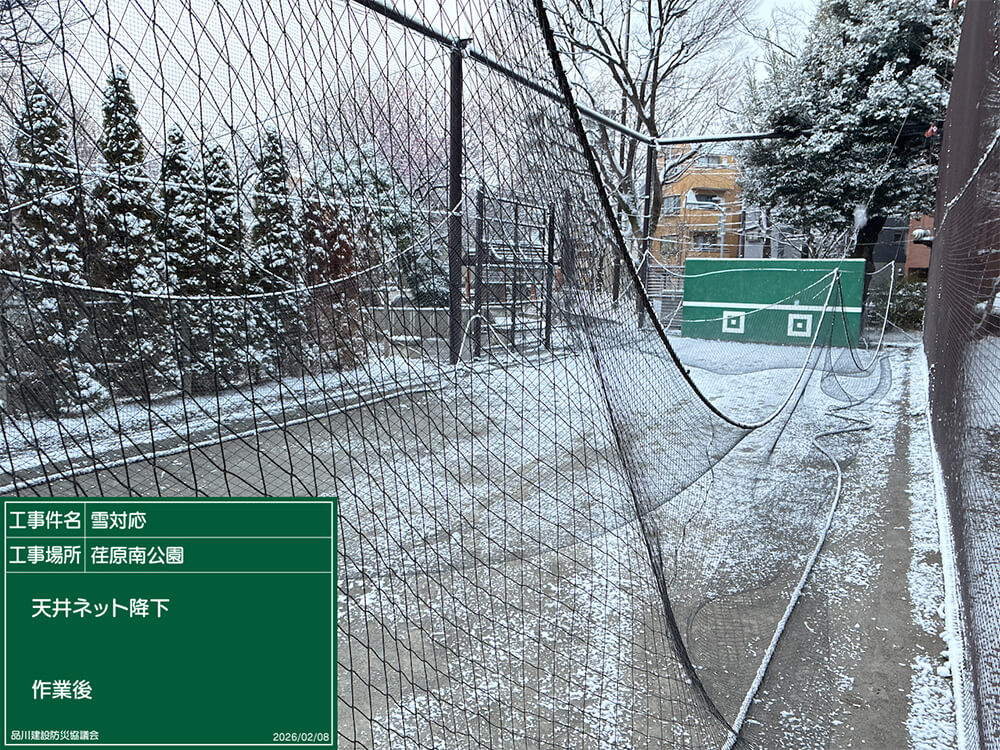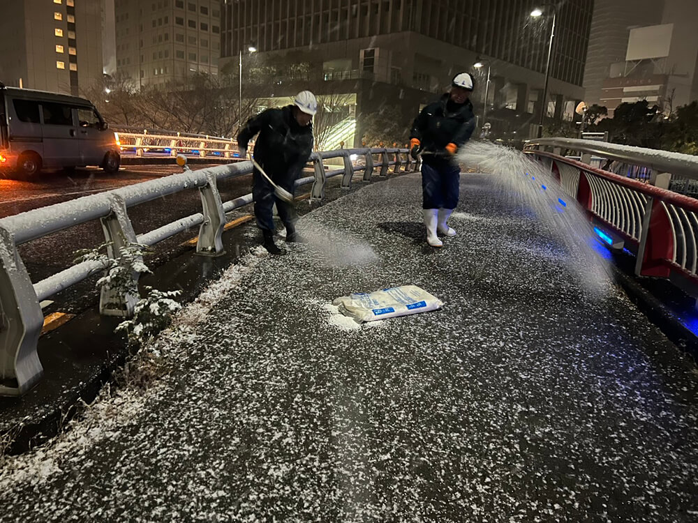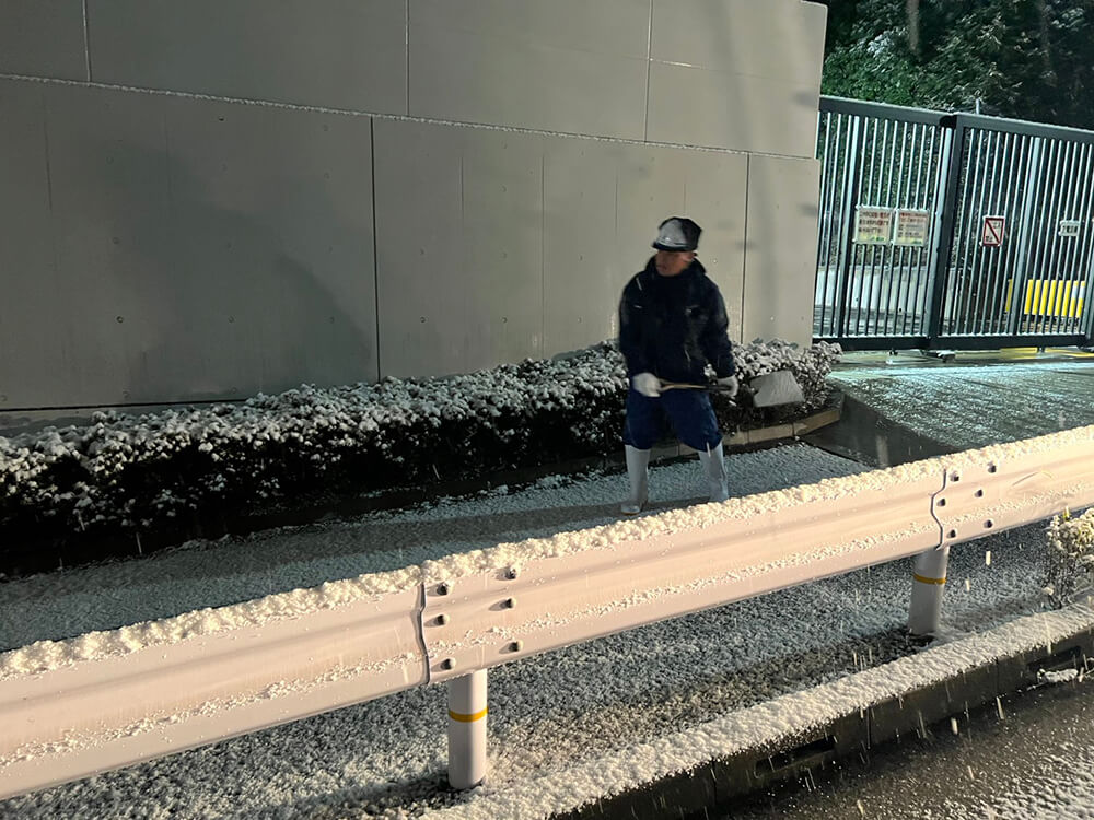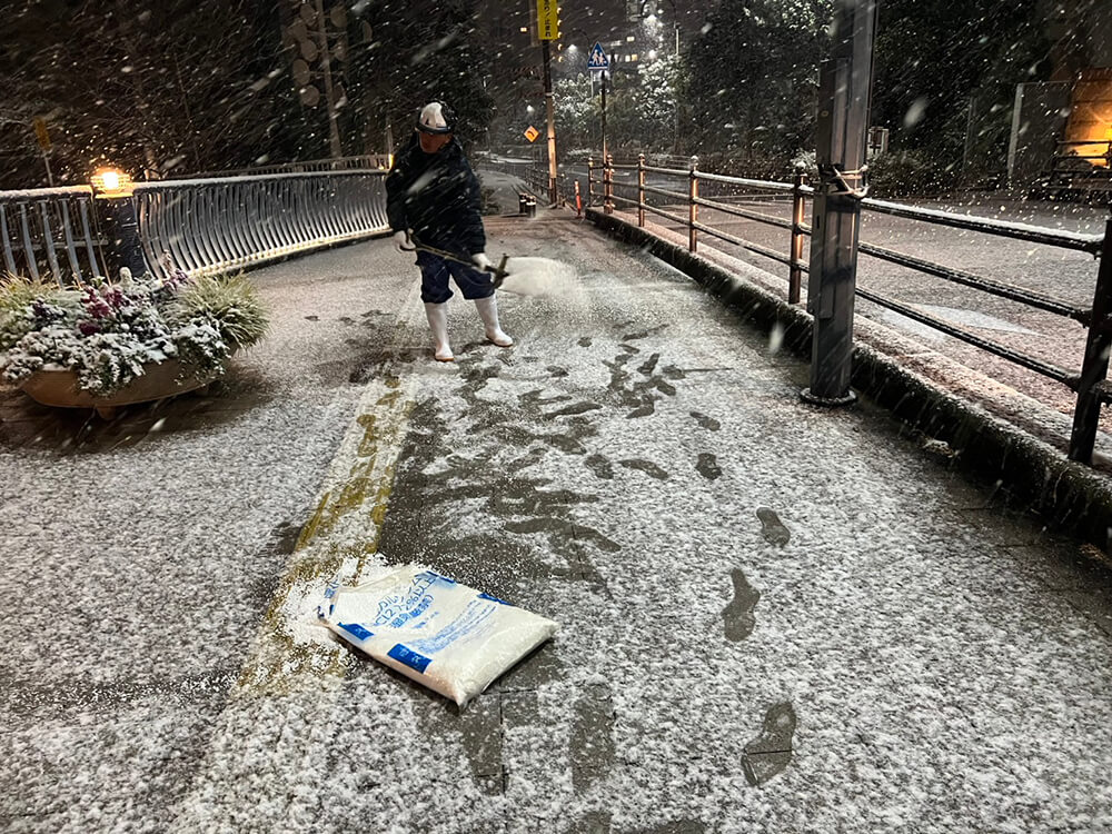 降雪が本格的になったAM3時頃から主要指定箇所の歩道橋や坂道に、凍結防止の塩化カルシウム散布の作業を行ったほか、公園キャッチボール場の天井ネットの降下作業を行いました。